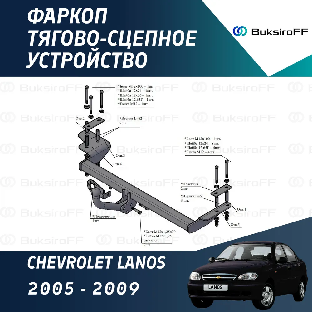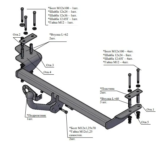 Комплект поставки: – ТСУ в сборе – 1шт. – Крепежные элементы – 1 комл. – Монтажный комплект (метизы) – 1 комл. – Сертификат на изделие – 1шт. – Пластиковый колпачек на крюк – 1шт.