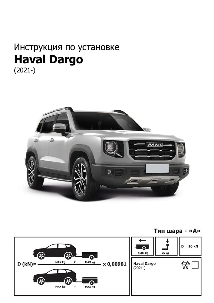 Фаркоп Berg (условно-съемный на 2 болтах, арт. F.9413.001) специально разработан для модели Haval Dargo (2022 по наст.) (Хавал Дарго ). Изделие обеспечивает повышенную надёжность при тяговой нагрузке до 2000 кг и вертикальной — 75 кг.
