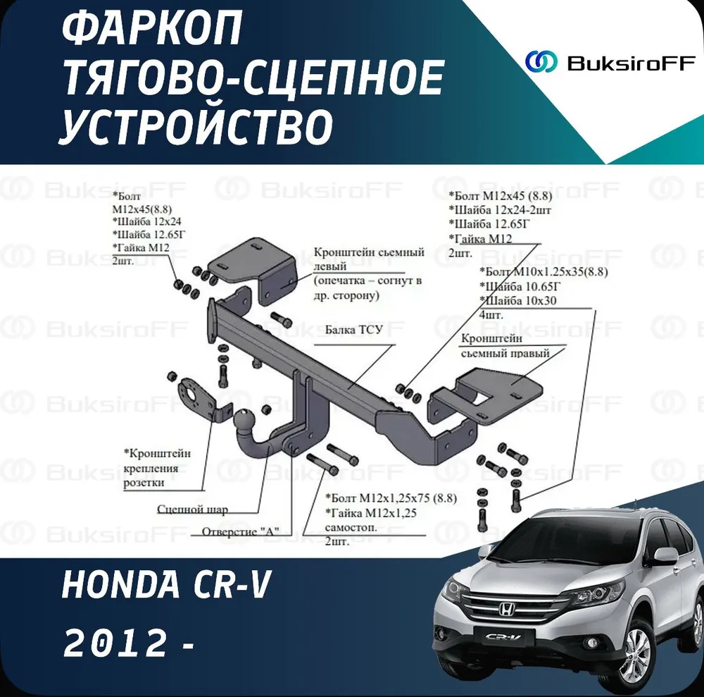 Фаркоп Трейлер на Honda CR-V RE5,RM4 (2012-2018), качественное и надёжное тягово-сцепное устройство, которое имеет условно-съемный на 2 болтах крюк, тяговую нагрузку 1100 кг., и вертикальную нагрузку 50 кг. Изготовлен фаркоп из толстостенного металла и отличается от аналогов повышенными характеристиками материалов.