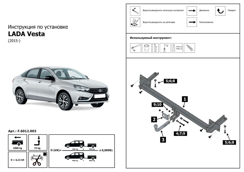 Фаркоп Berg (условно-съемный на 2 болтах, арт. F.6012.003) специально разработан для модели Lada Vesta 2180/81 (2015-2023) (Ладу Веста ). Изделие обеспечивает повышенную надёжность при тяговой нагрузке до 1000 кг и вертикальной — 75 кг.