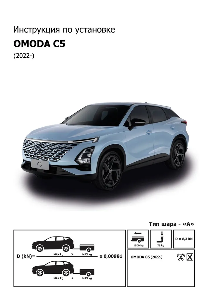 Фаркоп Berg (условно-съемный на 2 болтах, арт. F.4511.001) специально разработан для модели Omoda C5 (2022 по наст.) (Омоду C5 ). Изделие обеспечивает повышенную надёжность при тяговой нагрузке до 1500 кг и вертикальной — 75 кг.