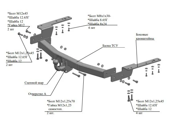 Комплект поставки: – ТСУ в сборе – 1шт. – Крепежные элементы – 1 комл. – Монтажный комплект (метизы) – 1 комл. – Сертификат на изделие – 1шт. – Пластиковый колпачек на крюк – 1шт.