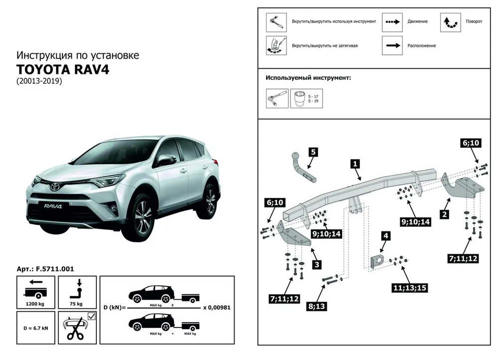 Фаркоп Berg (условно-съемный на 2 болтах, арт. F.5711.001) специально разработан для модели Toyota RAV4 XA40 (2013-2019) (Тойота РАВ4 ). Изделие обеспечивает повышенную надёжность при тяговой нагрузке до 1200 кг и вертикальной — 75 кг.