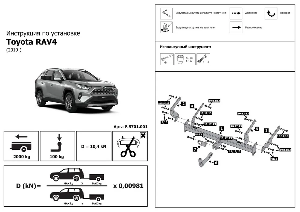 Фаркоп Berg (условно-съемный на 2 болтах, арт. F.5717.001) специально разработан для модели Toyota RAV4 XA50 (2019 по наст.) (Тойота РАВ4 ). Изделие обеспечивает повышенную надёжность при тяговой нагрузке до 2000 кг и вертикальной — 100 кг.