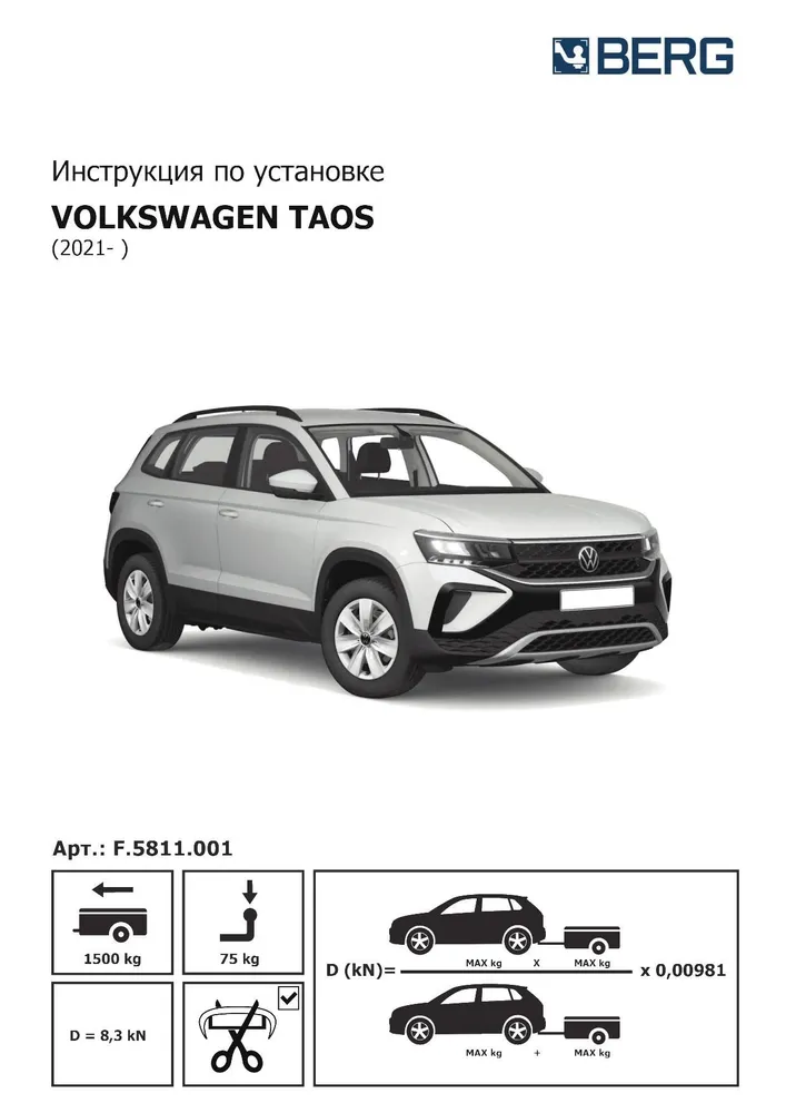 Фаркоп Berg (условно-съемный на 2 болтах, арт. F.5811.001) специально разработан для модели Volkswagen Taos (2021 по наст.) (Фольксваген Таос ). Изделие обеспечивает повышенную надёжность при тяговой нагрузке до 1500 кг и вертикальной — 75 кг.