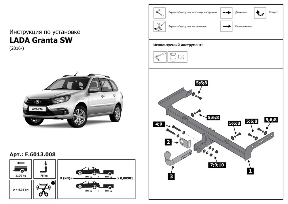 Фаркоп Berg (условно-съемный на 2 болтах, арт. F.6013.008) специально разработан для модели Lada Granta 2190,2191,2194 (2012 по наст.) (Ладу Гранта ). Изделие обеспечивает повышенную надёжность при тяговой нагрузке до 1100 кг и вертикальной — 75 кг.